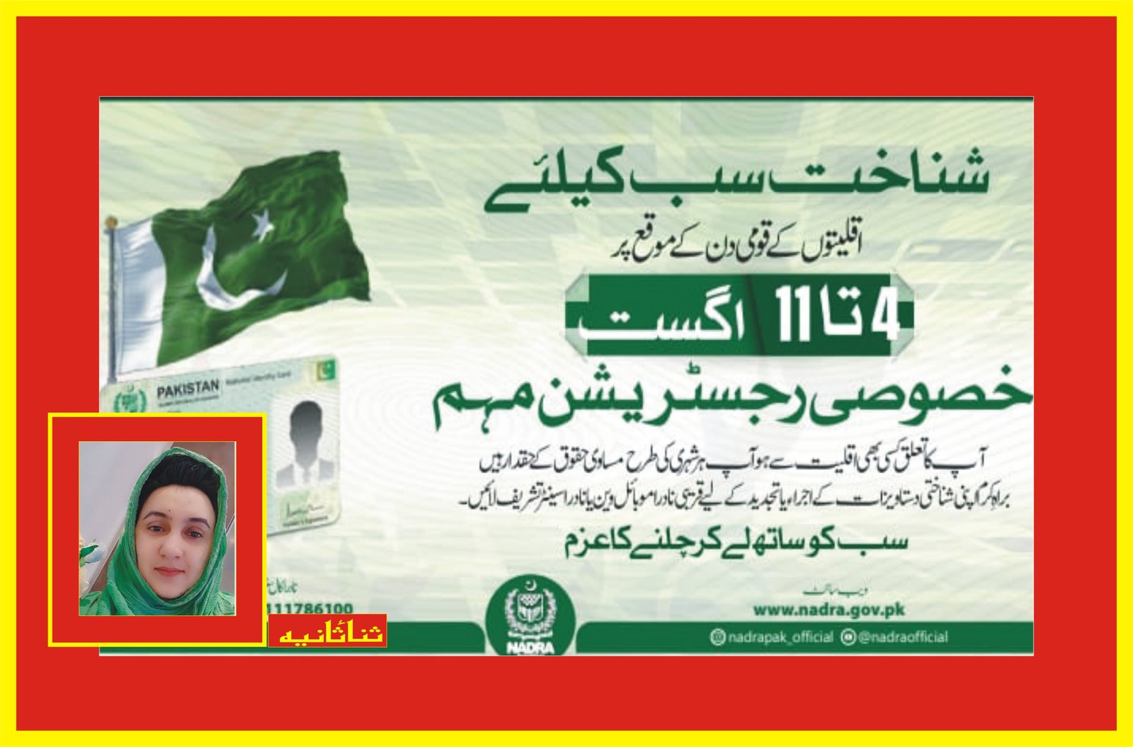 نیشنل ڈیٹا بیس رجسٹریشن اتھارٹی (نادرا) کی جانب سے مذہبی اقلیتو ں سے تعلق رکھنے والے افراد کی رجسٹریشن کے لئے خصوصی مہم کا آغاز کردیا گیاہے۔ 4اگست سے شروع ہونے والی رجسٹریشن مہم یوم اقلیت 11اگست تک جاری رہے گی اس مہم کے دوران اقلیتی برادری سے تعلق رکھنے والے افراد کا اندراج ترجیحی بنیادوں پر کیا جائے گا اس حوالے سے نادرا کی جانب سے جاری ہدایات میں کہا گیاہے کہ اقلیتی برادری سے تعلق رکھنے والے افراد رجسٹریشن کے لئے قریبی نادرا سنٹر یا موبائل وین سے رابطہ کر سکتے ہیں۔ خصوصی مہم کے دوران اقلیتی آبادیوں میں نادرا کی رجسٹریشن وین بھجوائی جائیں گی۔